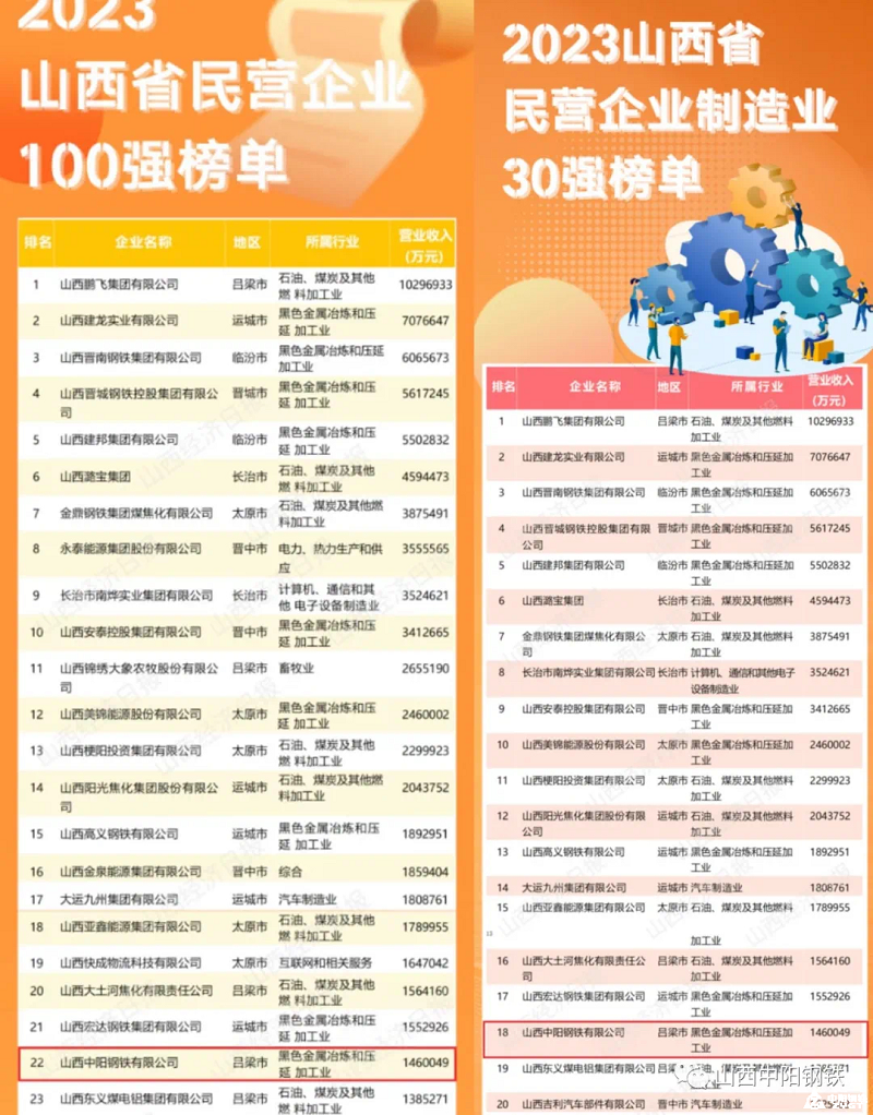 据了解,这是山西省工商联自2017年以来连续7年组织发布山西省民营企业100强系列榜单。榜单显示,2023山西100强民企的发展规模、产业结构、盈利能力、社会贡献等多个方面取得了显著进步。100强的入围门槛达33.11亿元,较上年提高了22.09%。百亿级民营企业达31家。开云手机站登入以1460049万元的营收水平,位居综合100强第22位、制造业30强第18位。