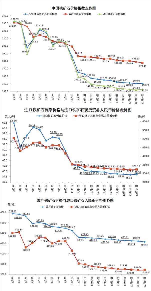 12月14日,中国铁矿石价格指数(CIOPI)150.20点,环比上升0.21点,升幅为0.14%。其中:国产铁矿石价格指数为177.40点,环比下降1.67点,降幅为0.93%;进口铁矿石价格指数为142.58点,环比上升0.74点,升幅为0.52%。