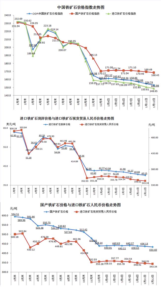 1月12日,中国铁矿石价格指数(CIOPI)152.98点,环比下降1.76点,降幅为1.14%。其中:国产铁矿石价格指数为169.43点,环比下降1.06点,降幅为0.63%;进口铁矿石价格指数为148.65点,环比下降1.96点,降幅为1.30%。