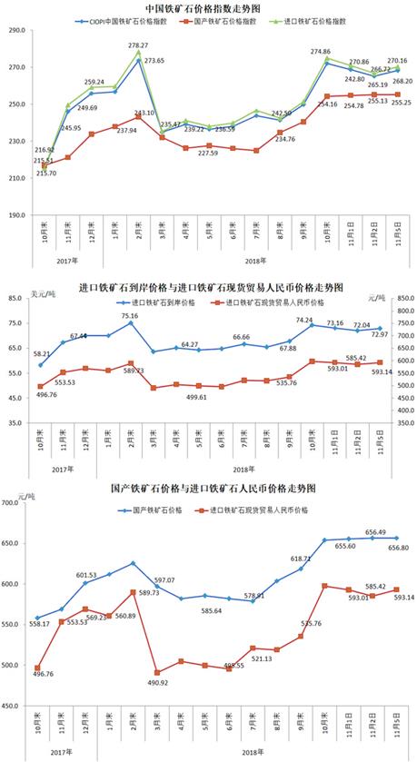 11月5日,中国铁矿石价格指数(CIOPI)268.20点,环比上升3.01点,升幅为1.13%。其中:国产铁矿石价格指数为255.25点,环比上升0.12点,升幅为0.05%;进口铁矿石价格指数为270.16点,环比上升3.44点,升幅为1.29%。