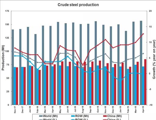 美国2019年4月粗钢产量为740万吨,同比提高7.3%。