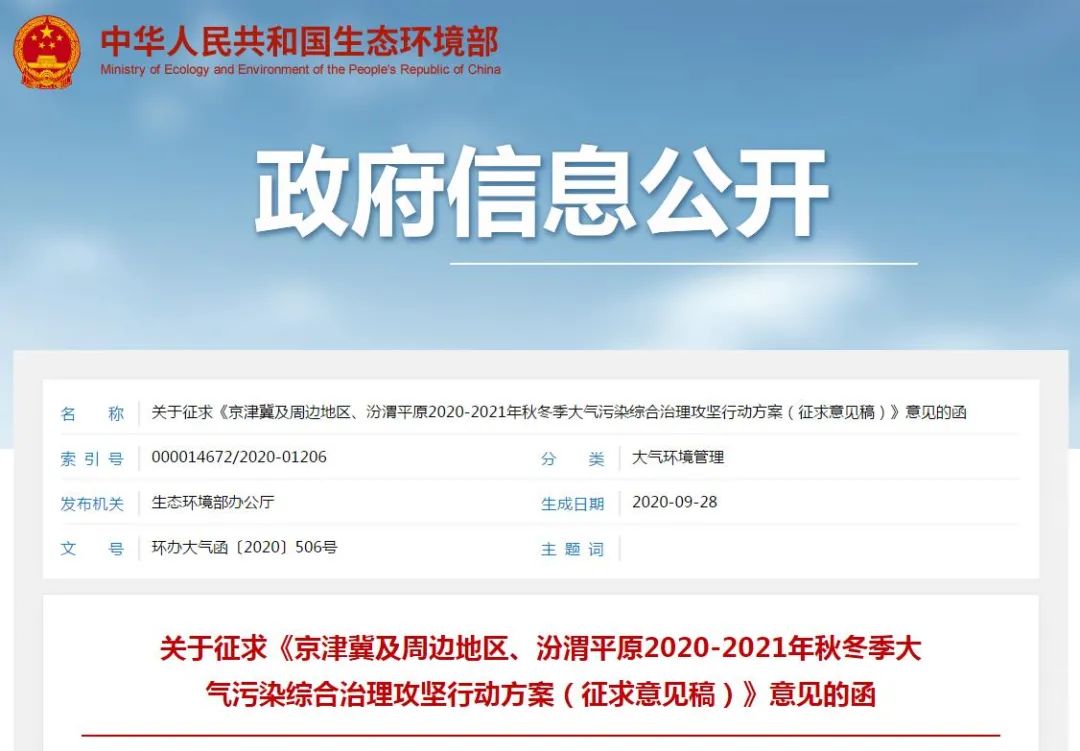 为落实《打赢蓝天保卫战三年行动计划》,切实加强京津冀及周边地区、汾渭平原2020-2021年秋冬季大气污染防治工作,9月28日,生态环境部发布了关于征求《京津冀及周边地区、汾渭平原2020-2021年秋冬季大气污染综合治理攻坚行动方案(征求意见稿)》意见的函(以下简称“《意见》”)。
